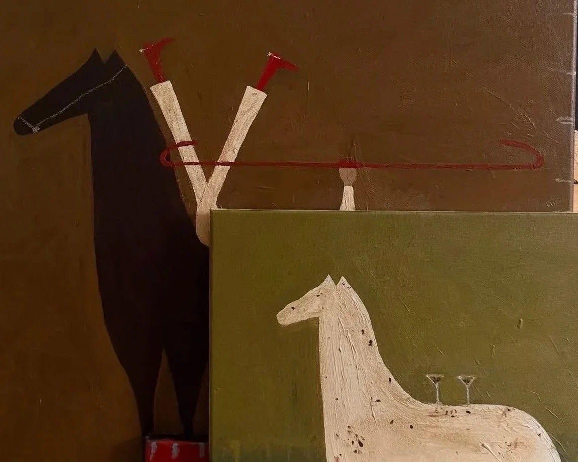 Her style is now best described as a minimalist take on Western folk surrealism. Her subjects, rider and horse alike, function as archetypes rather than portraits. Through elongated limbs, flattened perspectives, and restrained palettes, she strips away anything peripheral. What remains is essence rather than likeness, presence rather than detail. A verse she returns to again and again anchors her work: "The horse is made ready for the day of battle, but victory rests with the Lord." Proverbs 21:31. It is not decorative. It is, by her account, foundational.